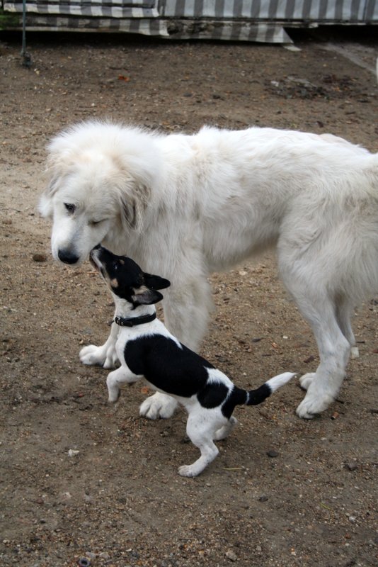 Il en va de même, bien sûr, avec la socialisation avec les autres chiens. Il est très fréquent que l’on laisse les chiens « jouer » (plus ou moins comme des brutes, plus ou moins avec un bouc-émissaire), et que l’on ne se rende pas compte, quand on a un œil peu entraîné, que l’un d’eux prend sur lui, voire flippe carrément (attention, donc, aux écoles du chiot qui laissent tout le monde jouer en vrac !). Ce chien, devenu adulte, risque de développer des craintes ou des défenses, s’il s’est fait bousculer petit, même « pour jouer ». Et puis, comme nous disait ma mère quand on faisait des batailles de coussins (on n’avait pas de polochons à la maison) : « Y en a une qui va finir par pleurer ! ». Et ça ne manquait pas. Au bout d’un moment, on s’énervait, on tapait plus fort, on faisait moins attention, et il y en avait une qui pleurait ; une fois parce qu’à force de m’exciter je suis tombée du canapé, une fois parce que j’ai reçu la fermeture éclair du coussin sur la dent, résultat une dent cassée, etc. Eh oui, c’était souvent moi qui pleurais parce que j’avais 4 ans de moins. De même, c’est souvent le petit chien qui « pleure ». Vous savez, ce fameux petit chien qui deviendra « un roquet » plus tard. Et que « les petits chiens, c’est tous des gueulards», et que« plus c’est petit, plus c’est hargneux »… Vous n’y voyez pas un lien ? En tant que propriétaire de petit chien, je m’insurge tous les jours contre ces affirmations. En fait, plus c’est petit, plus c’est difficile à socialiser, car il y a toujours un moment où quand on pèse 1,2 kg et que l’on joue avec des bébés de 10 gk, ben on ramasse, quoi… On ne connaît pas ça chez les humains, un bébé qui fait 11 kg, qui joue avec un autre du même âge, avec les mêmes gestes mal affinés, mais qui en pèse 110 ! Mais si c’était le cas, je pense que les surveillances des crèches atteindraient encore un autre niveau ! Attention, hein, certains petits chiens ont un fort caractère et ne sont absolument pas gênés de se confronter à des grands. C’est simplement qu’il faut être vigilants au moindre signal d’inconfort.