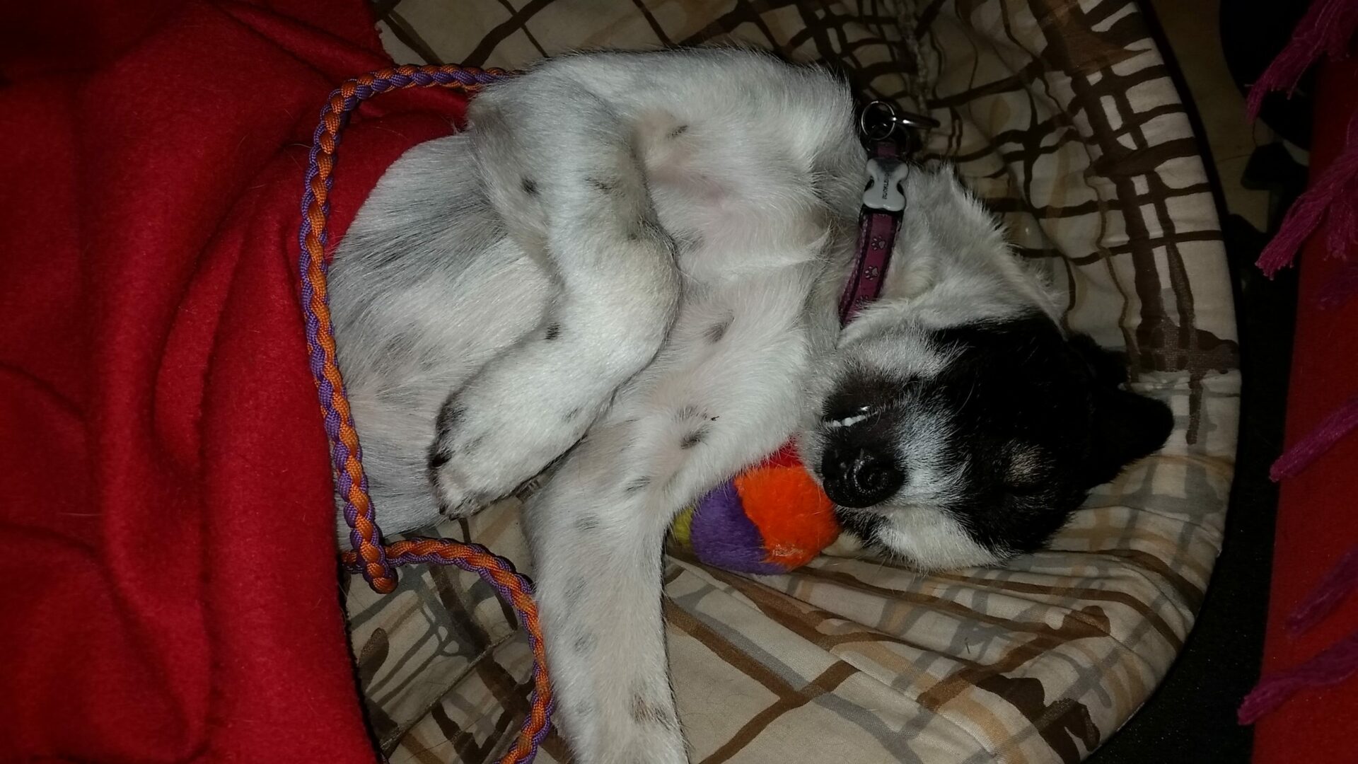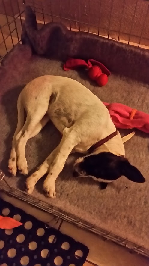 Quand vous estimez que votre chiot a eu assez de stimulations (après une balade, après un jeu avec vous, quand il a joué tout seul un bon moment…), emmenez-le dans sa « cabane à rêves ». Et s’il ne sait pas encore y rester, personnellement, soit je ferme la porte du parc, soit je le mets en laisse (en accrochant la laisse à moi ou à un meuble). En réalité, j’utilise plutôt une veille corde, parce que sa laisse, il risque de la manger… Alors je sais, je vois vos regards effarés : elle attache son chien dans la maison !!! Mais tout est dans l’état d’esprit. Ca n’est absolument pas une punition. Il est juste en laisse (la laisse ne doit pas être associée à de l’excitation, ni à la punition). On lui parle gentiment, on le calme, on le masse. On est la fée du sommeil ! Quand Yopp était excité, impossible à arrêter, je lui mettais sa laisse, et il se posait et s’endormait illico, parce qu’en réalité, il était épuisé, et il avait besoin qu’on le lui fasse remarquer !