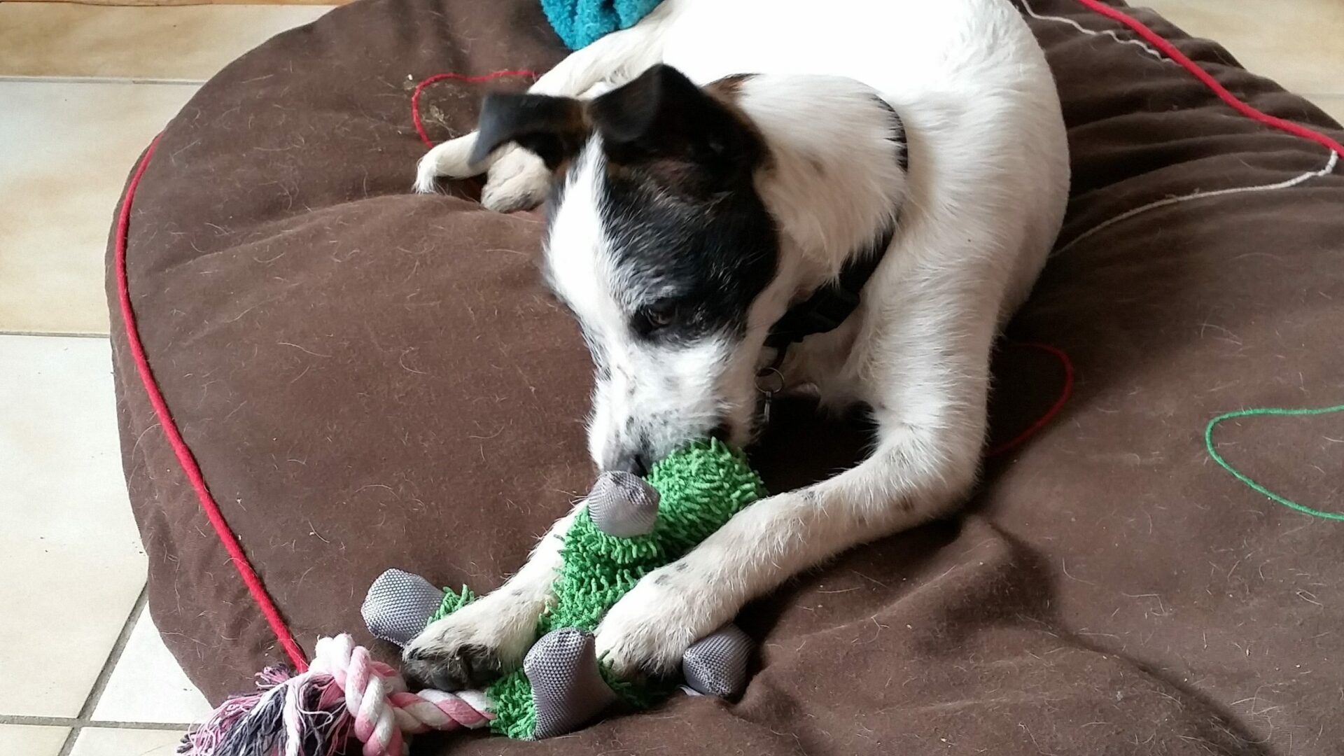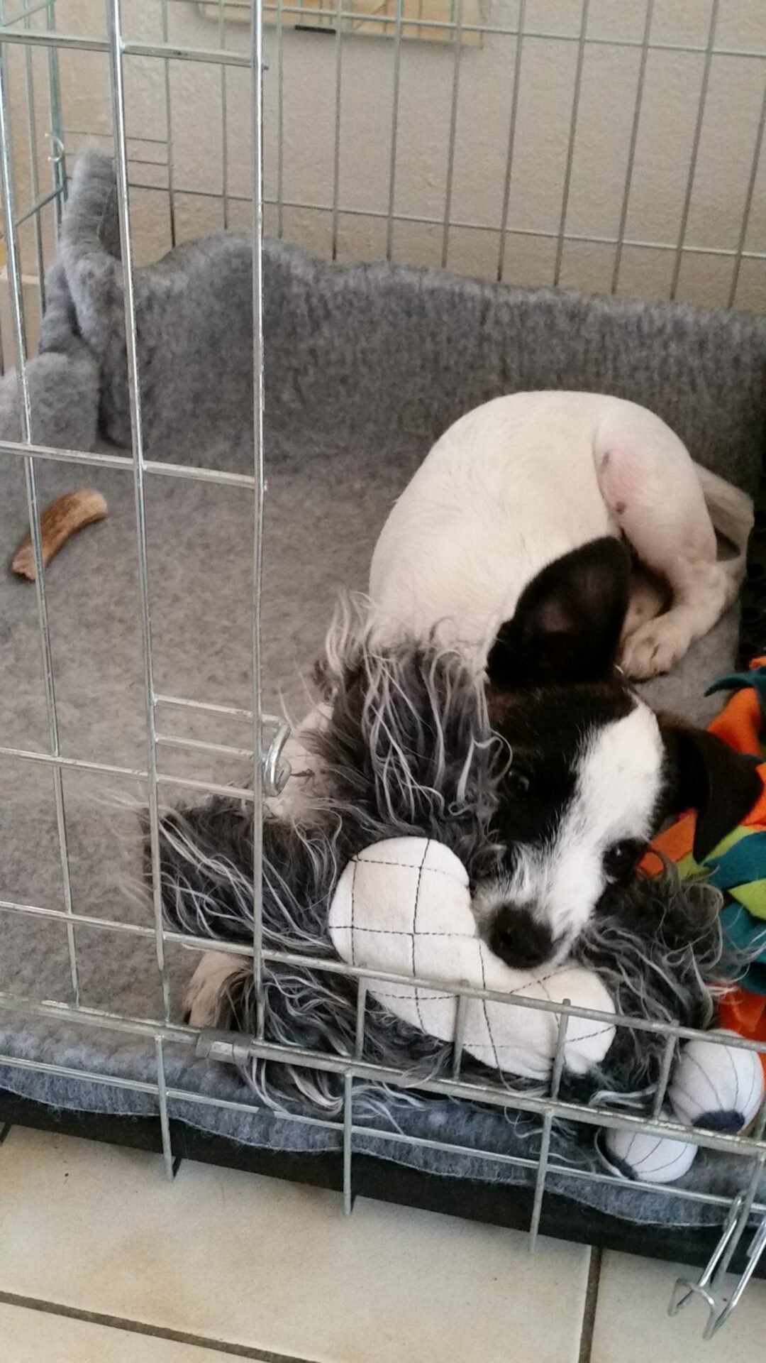Un extrait de Yopp qui joue sagement dans sa caisse magique. Dans sa caisse, vous voyez un tapis de fouille (où je cache des friandises), un os à mâcher, des jouets, un tapis confortable et absorbant en cas de pipi.