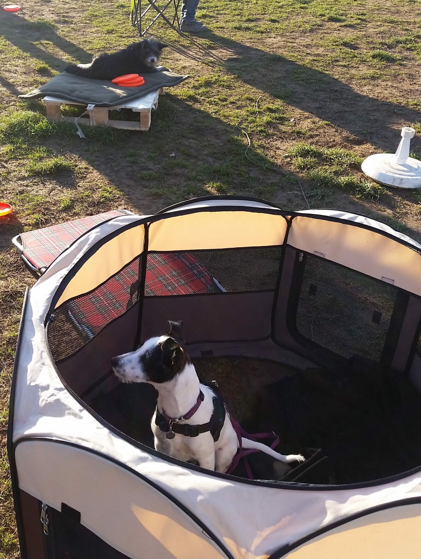 Et un exemple de parc à chiots en tissu que j’utilisais au début pour le terrain, mais il n’a pas duré longtemps